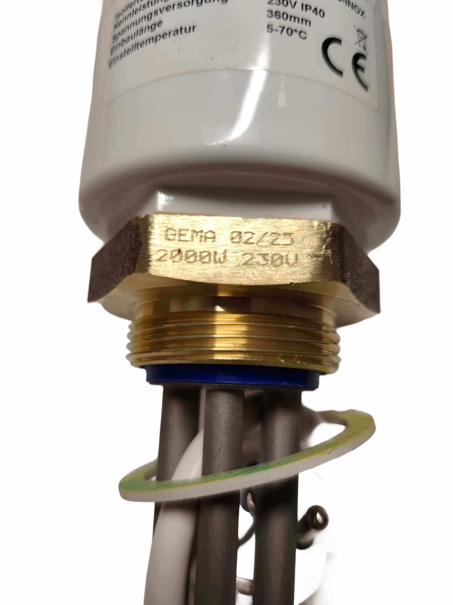 Med en effekt på 1500 W eller 2000 W og et nedsænkningsareal på 360 mm tilbyder varmelegemet fremragende varmeydelse. Dets præcise design med en 80 mm uopvarmet zone og en standardiseret 6/4" gevindtilslutning muliggør problemfri integration i forskellige systemer.