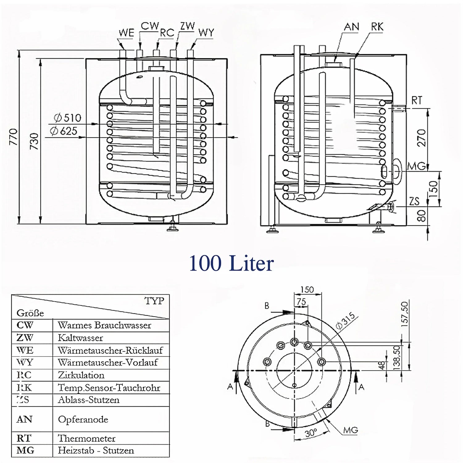 ETWS varmtvandsbeholderen på 100 liter bruges til central og sikker varmtvandsopvarmning.