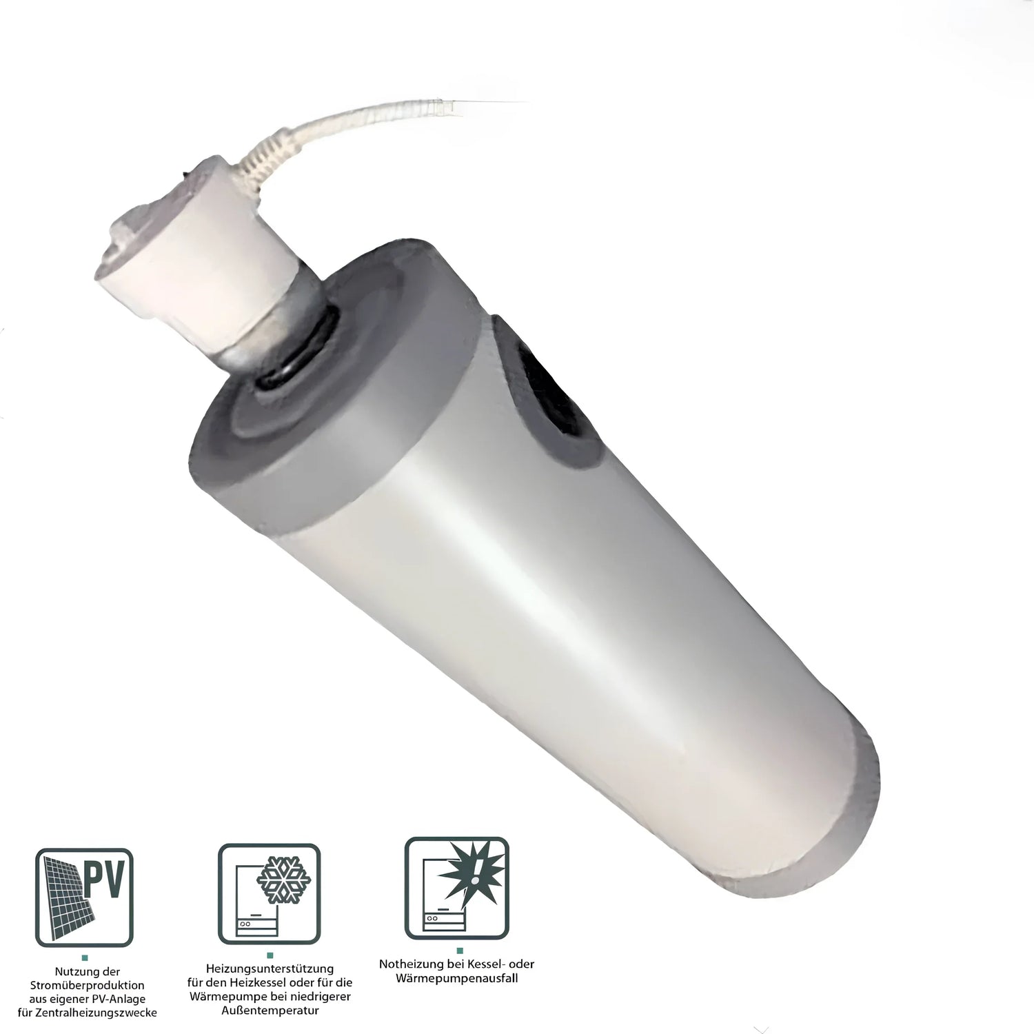 The simple integration of the heating cartridge into existing storage tanks is made possible by the 1 1/2" External thread connection and a compact installation length of 735 mm are supported. A 1.5-meter-long connection cable also enables uncomplicated power supply.