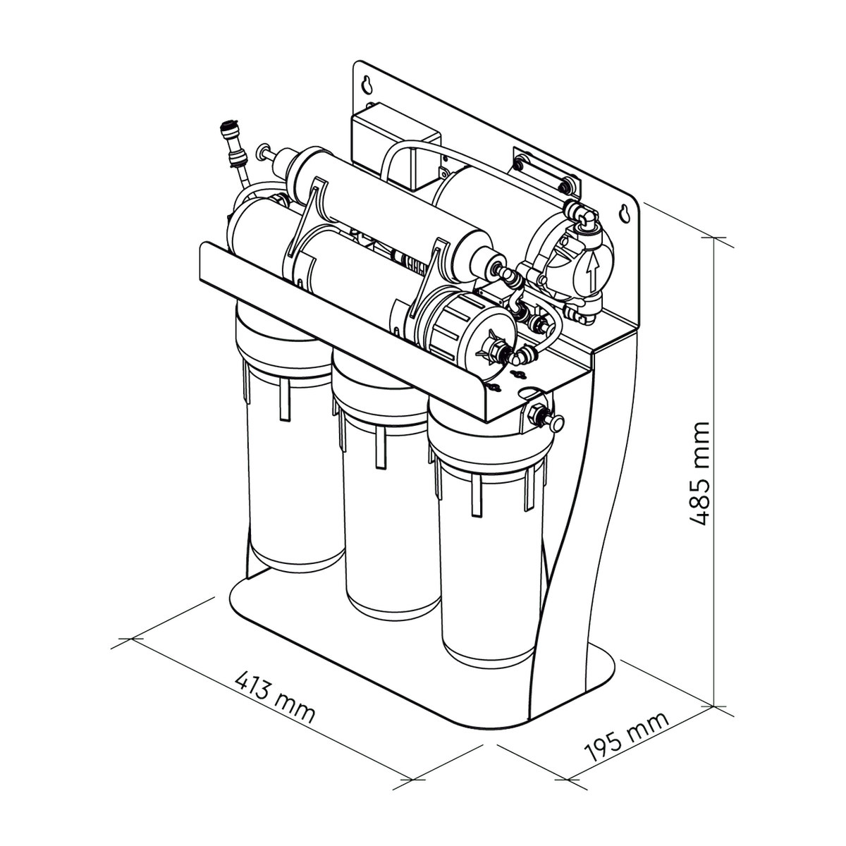 El marco metálico independiente permite una instalación rápida y sencilla debajo del fregadero o en otras áreas de servicio. Todas las conexiones, válvulas y adaptadores están incluidos y se pueden instalar sin necesidad de herramientas especiales.