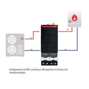 Équipé d'une membrane interne et d'un séparateur hydraulique, le ballon de stockage sert également de distributeur pour deux circuits de chauffage ou de refroidissement maximum. Ainsi, il assure non seulement une stratification efficace des fluides, mais coordonne également de manière fiable la distribution des fluides de chauffage ou de refroidissement.