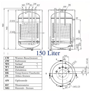 Le ballon de stockage a une capacité de 150 litres et offre une surface d'échange thermique de 1,4 m², permettant d'accueillir un volume de 6,1 litres. Les raccordements sont 3/4" AG, pour un raccordement aisé du départ, du retour et de la circulation. De plus, un raccordement pour un élément chauffant électrique (1 1/2" IG) intégré.