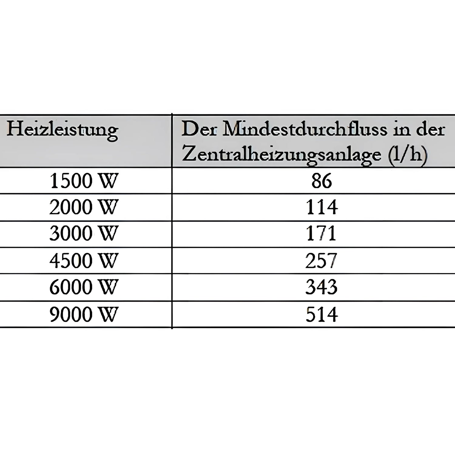 Ráthaíonn na rátaí sreafa íosta – 86 l/u le haghaidh 1.5 kW, 114 l/u le haghaidh 2.0 kW, 171 l/u le haghaidh 3.0 kW, 257 l/u ag 4.5 kW, 343 ag 6.0 kW agus 514 ag 9.0 kW – aistriú teasa éifeachtach agus oibriú réidh fiú le riachtanais teasa éagsúla.