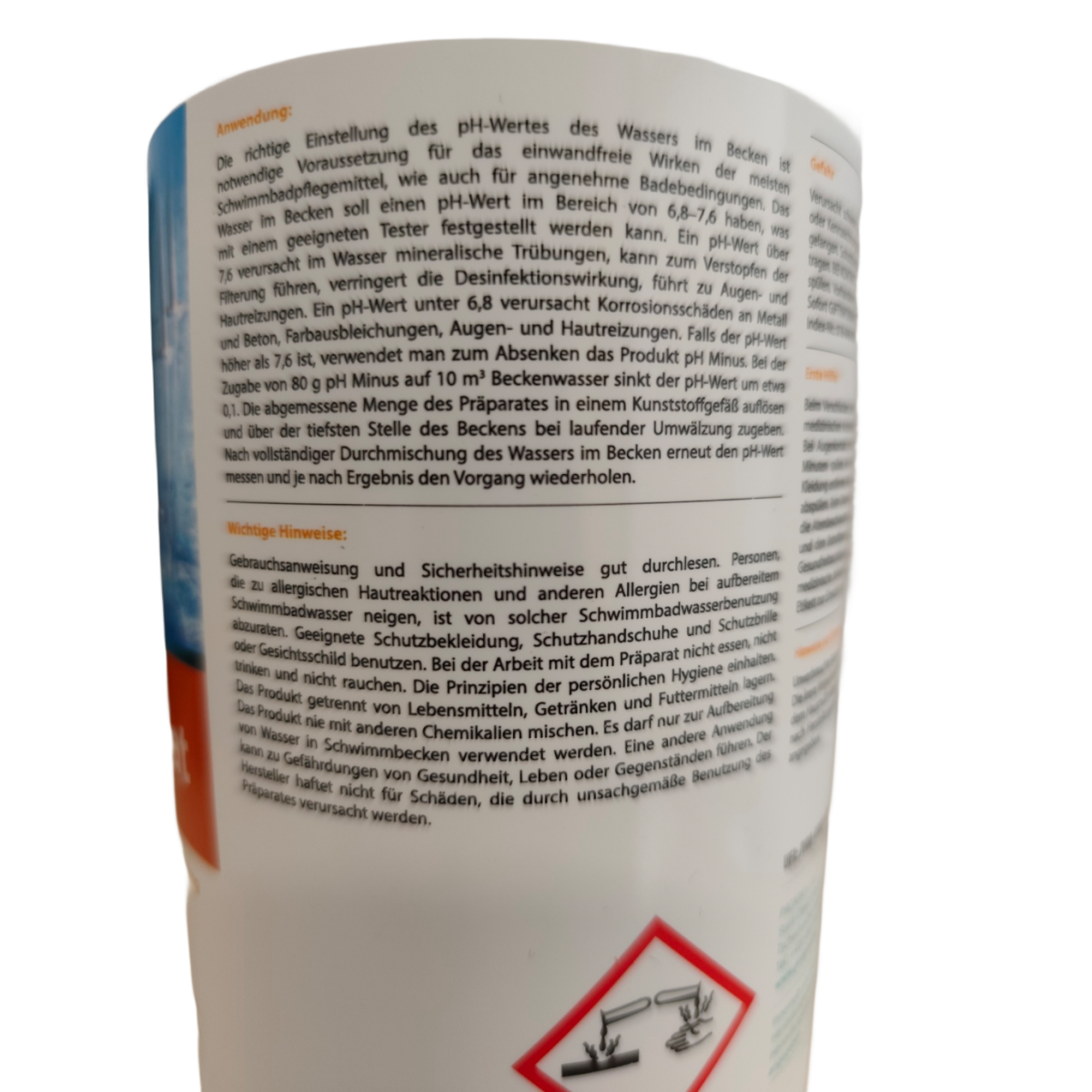 Ako je pH vrijednost iznad 7,6, koristi se pH Minus 1,5 kg za njezino ciljano snižavanje i time dovođenje vode za kupanje u optimalni raspon.
