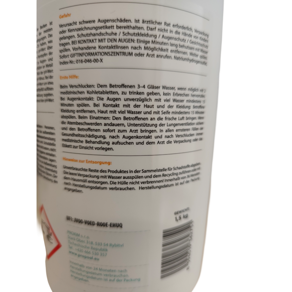 S pH Minus 1,5 kg dobivate proizvod za precizno podešavanje pH vrijednosti u vodi vašeg bazena. Brzo djeluje, brzo se otapa i nudi sigurnu primjenu, omogućujući ugodno iskustvo plivanja samo nekoliko sati nakon tretmana. Ovaj proizvod je posebno razvijen za učinkovito snižavanje pH vrijednosti kada se izmjeri prekomjerno, bez ugrožavanja kvalitete vode ili korištenih proizvoda.