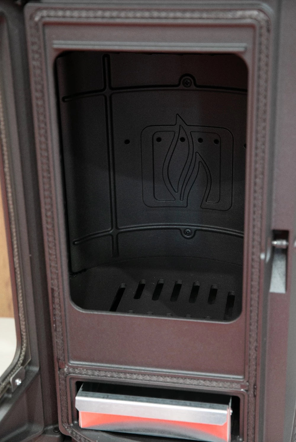 A kályha gondosan zárt, nagy, kivehető hamutartóval és kényelmes ajtófogantyúval van felszerelve; folyamatos égésre alkalmas és mindennapi használatra tervezték.