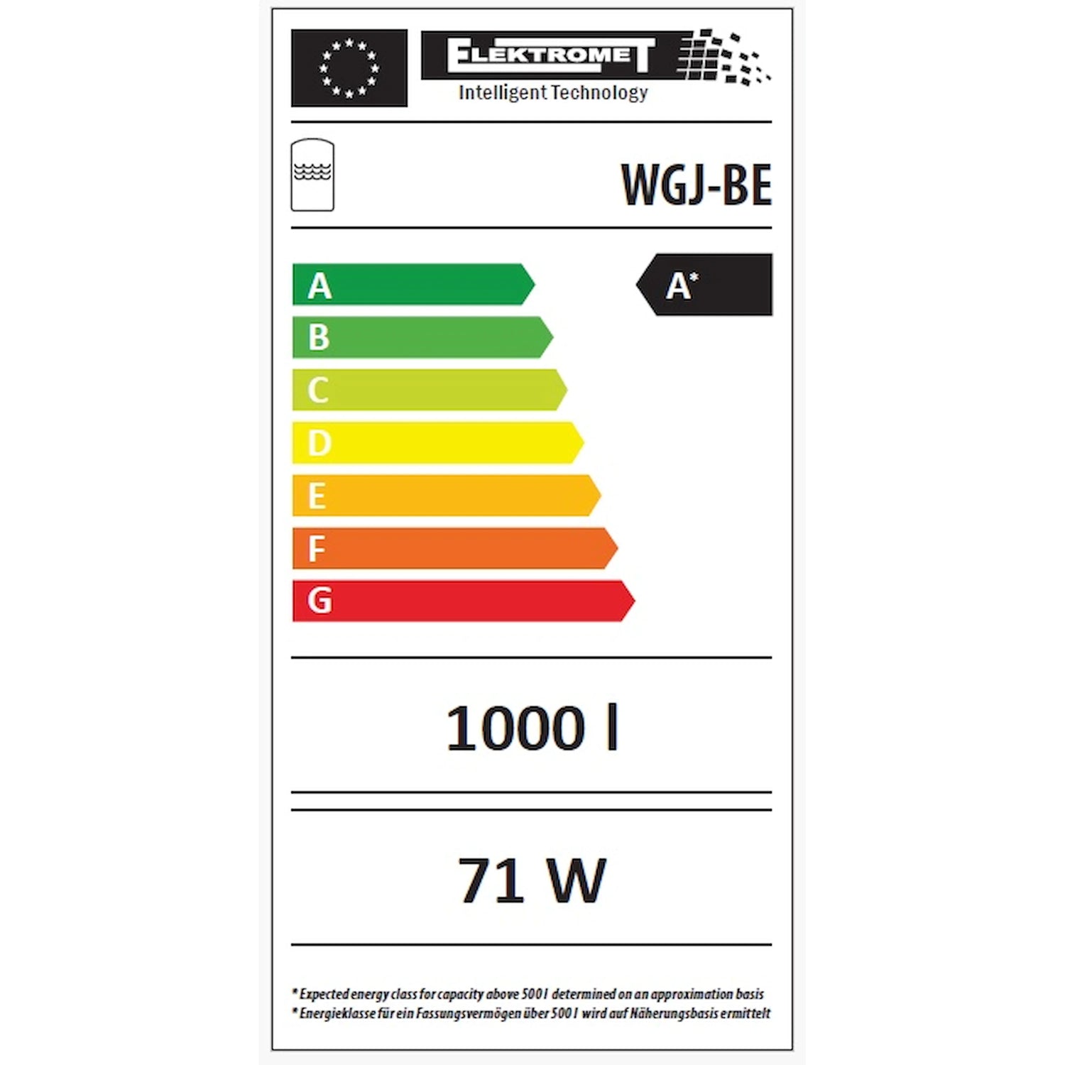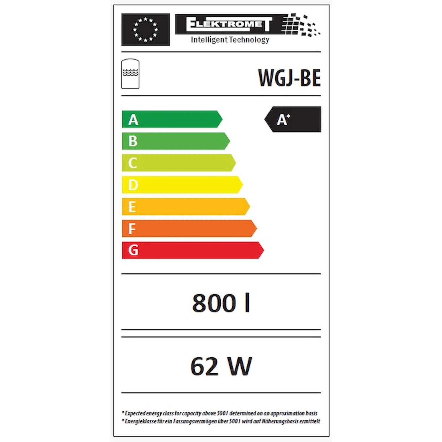 WGJ-BE 800: Volume de armazenamento aprox. 710 l, perdas em espera aprox. 62 W, peso ~143 kg. WGJ-BE 1000: Volume de armazenamento aprox. 830 l, perdas em espera aprox. 71 W, peso ~160 kg. Pressão máxima de operação: 0,3 MPa; Temperatura máxima de operação: 80 °C.
