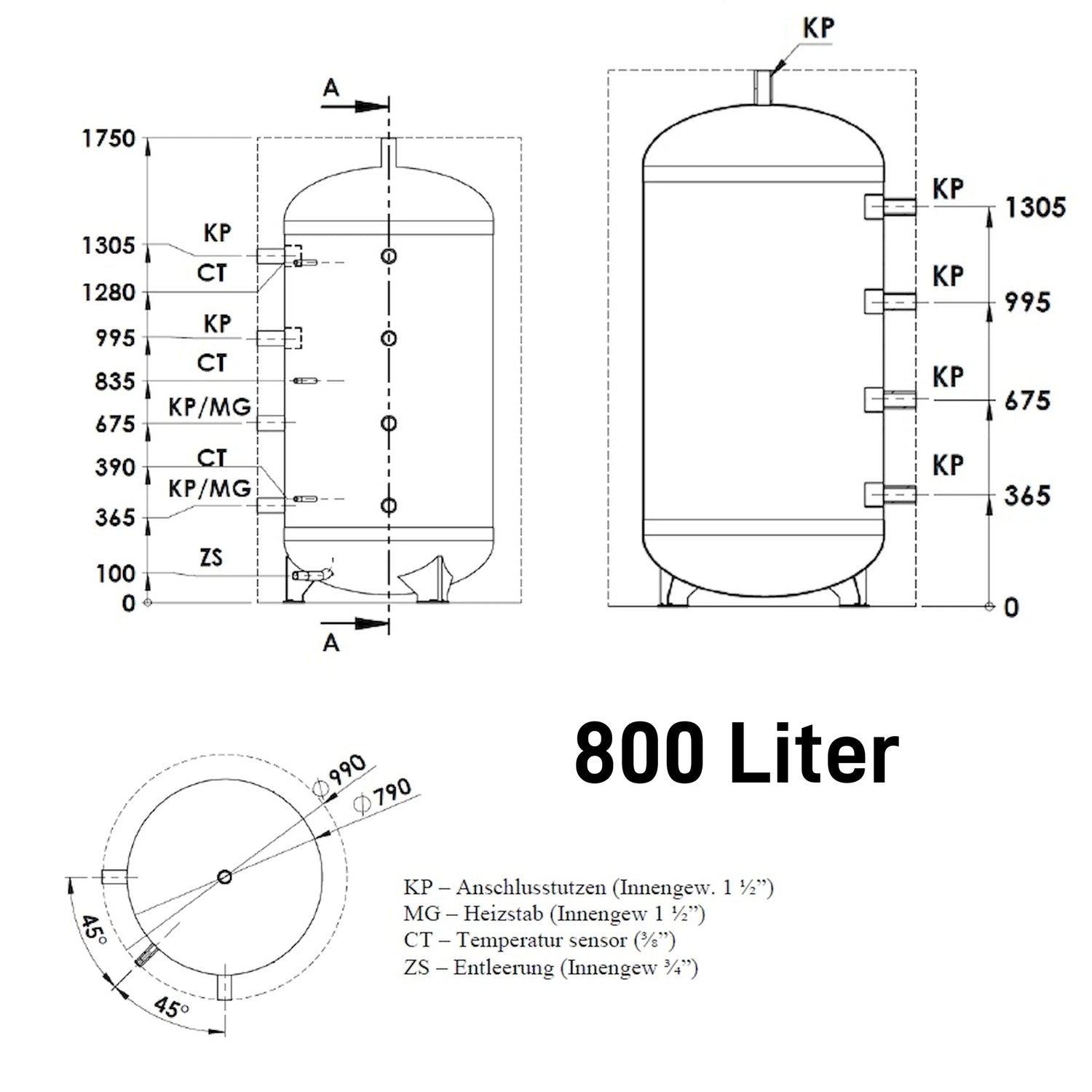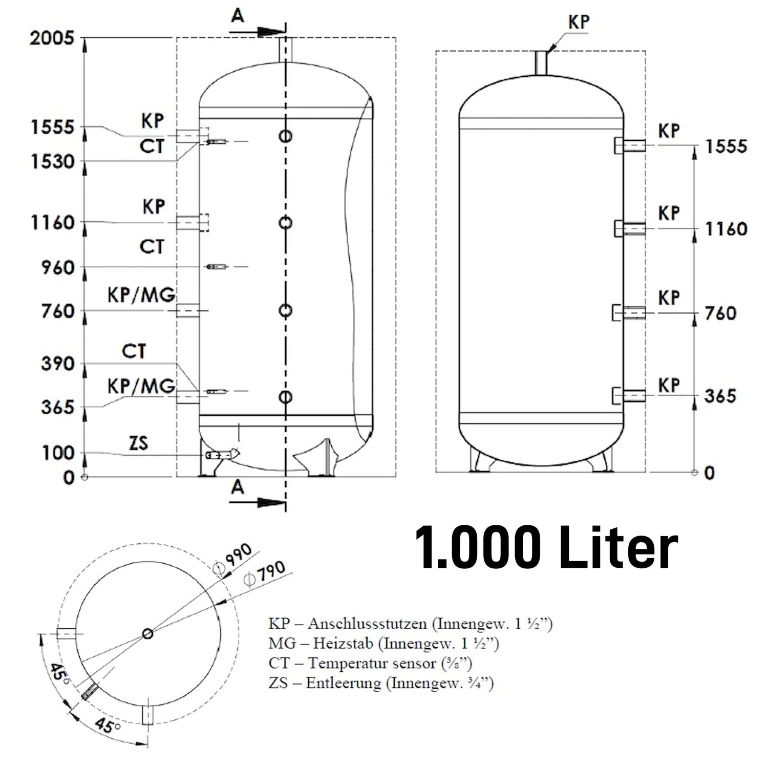Dimensões da conexão: Conexão do espigão (KP) com rosca interna de 1½”, conexão do elemento de aquecimento (MG) com rosca interna de 1½”, conexão do sensor de temperatura (CT) de 3/8"Drenagem (ZS) Rosca interna 3/4".