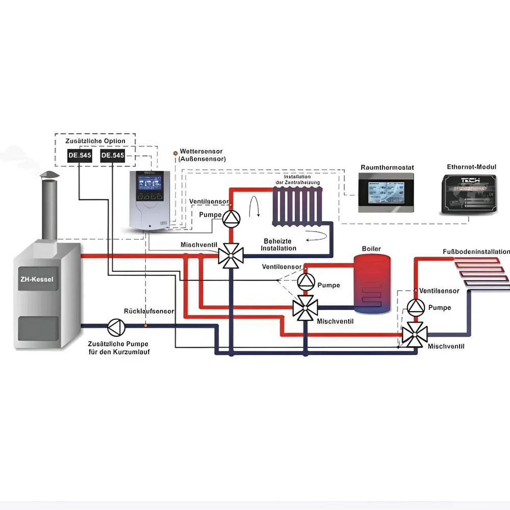 Controlador de circuito de aquecimento com compensação climática TECH i-1 CWU (EU-i-1 DHW) Ele controla uma válvula misturadora de 3/4 vias, incluindo uma bomba de válvula e uma bomba de água quente adicional. Através de um sensor externo (compensação climática), programação semanal e conexão com termostato ambiente, ele mantém uma temperatura de fluxo estável e permite... Proteção contra refluxo Na caldeira. Ideal para modernização e novas construções – tanto para proprietários de casas particulares quanto para instaladores.