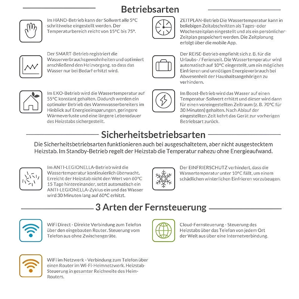Três tipos de controle remoto estão disponíveis para você: WiFi Direct permite uma conexão direta entre o telefone e o elemento de aquecimento, enquanto WiFi na rede garante o controle através do roteador doméstico. Você também pode operar o dispositivo de qualquer lugar do mundo usando o controle remoto na nuvem.